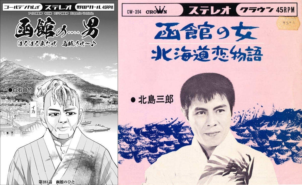281화 '하코다테의 남자函館の男'는 엔카가수인 키타지마 사부로北島三郎의 '하코다테의 여인函館の女'의 레코드 표지 오마주. 그래서 옷과 표정도 실존인물 그대로 따라했구나.