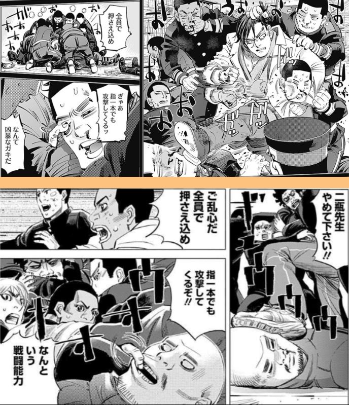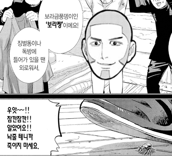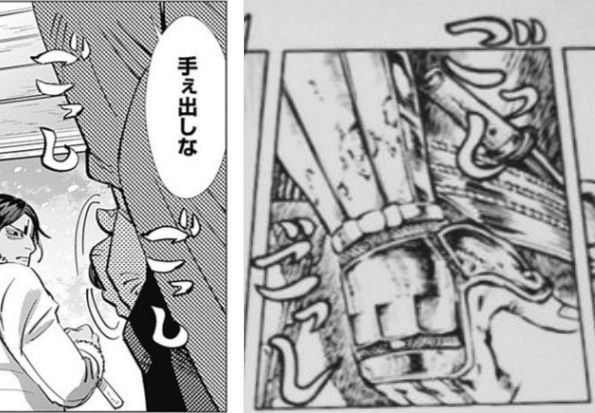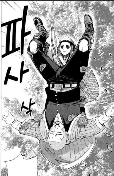 망치가 손에 붙은 코이토에게 소변을 뿌려 떼주려는 스기모토의 모습(고시고시란 의성어와 함께)은... 90년대 점프에 연재되었던 '꽃의 케이지(花の慶次)'가 모티브라고 말하더라고요.