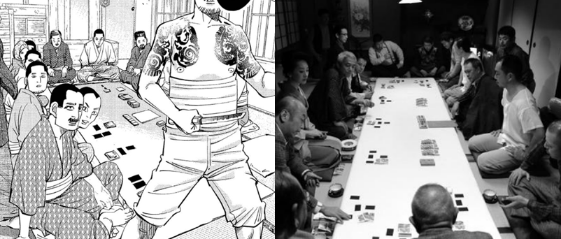 이건 패러디는 아니지만. 105화 번개 부부가 난입한 도박장은 테혼비키(手本引き)라고 하는 게임인데, 심리전과 두뇌싸움이 필요한 도박이라 초보자가 할 수 있는 것은 아니라고 합니다. 즉 어느정도 도박 좀 해봤단 사람만 할 수 있는데..