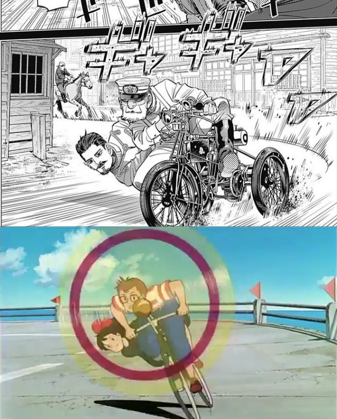 199화 '언덕 위의 러시아 영사관' 오토바이 타고 가는 코이토네 아부지와 츠루미의 모습은 1989년 애니메이션 '마녀배달부 키키'의 오마주입니다.