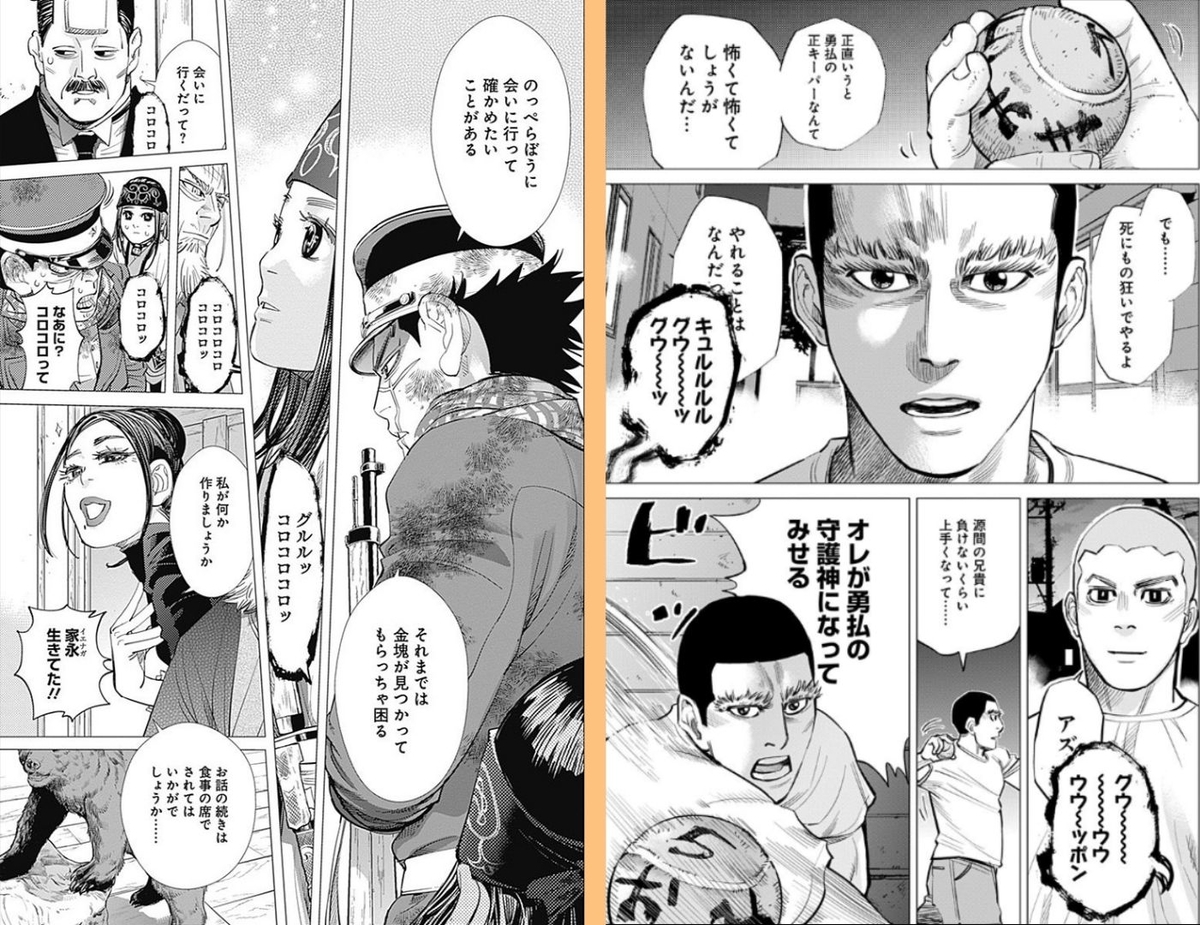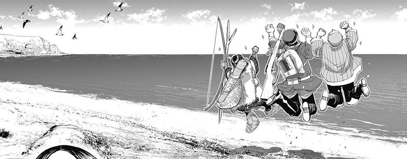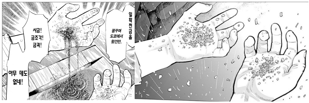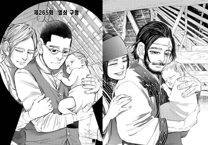 1화의 흙만 잡는 스기모토의 손과, 287화 사금을 잡는 스기모토의 손이 같은 동작이라던가. 오타쿠는 이런 수미상관에 약한데.