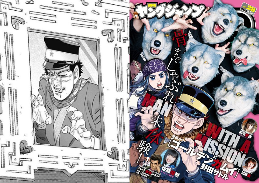 등대의 노부부에게 스기모토가 드렸던 사진의 포즈는 아마 2016년 영점프에서 MAN WITH A MISSION라는 록밴드가 나온 표지가 바탕이 된 것 같다고 추측하더라고요. 저 당시 연재시기가 2018년이었는데 왜 2년 묵은 떡밥을 가져오냐 하면.. 아마 2018년 골카 애니 1기 오프닝 가수가 MAN WITH A MISSION라서. 시기가 겹쳐서 과거의 표지 콜라보의 소재를 가져온 것 아닐까 합니다.