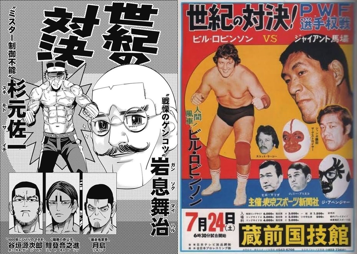 144화 '격돌! 벽 데스매치'의 표지 그림은 일본 프로레슬러 '자이언트 바바ジャイアント馬場'의 레슬링 포스터 오마주입니다. 209cm의 키로 당시 거인이라고 불렸고. 앗 괴짜가족에 나왔던 그 아저씨잖아.