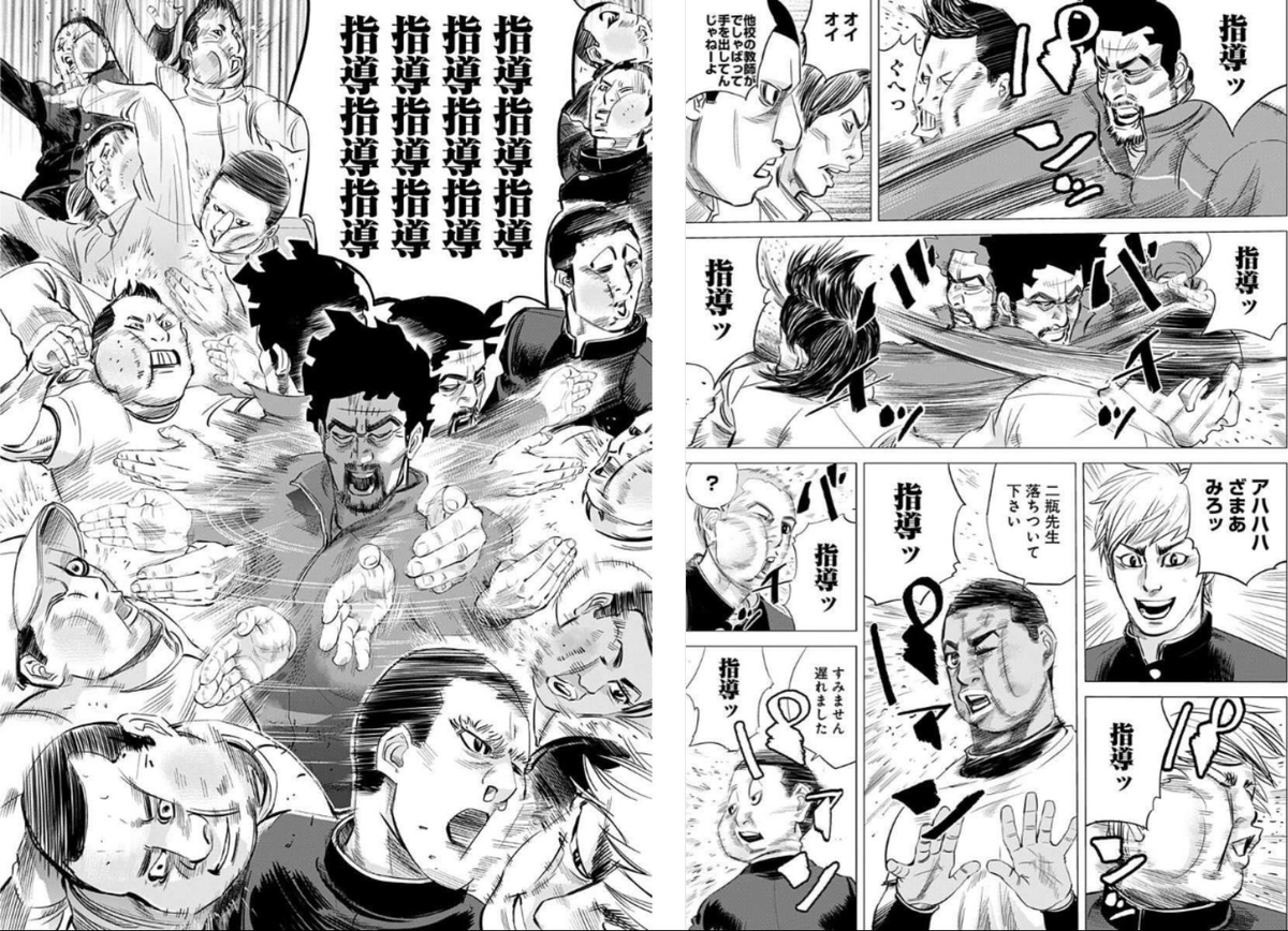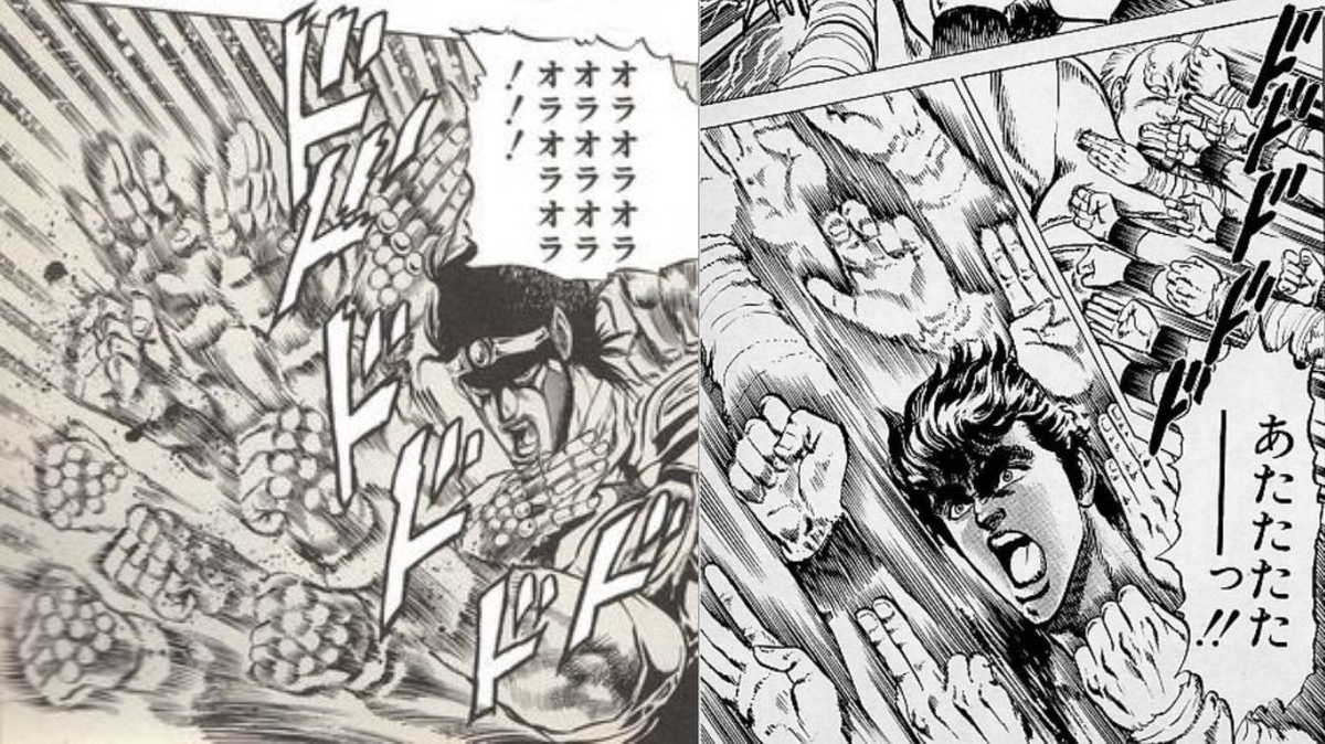 그 장면의 시초는 '북두의 권'이었고. 본인 전작인 '스피나마라다'에도 마구잡이로 때리는 장면이 나온 적 있음.