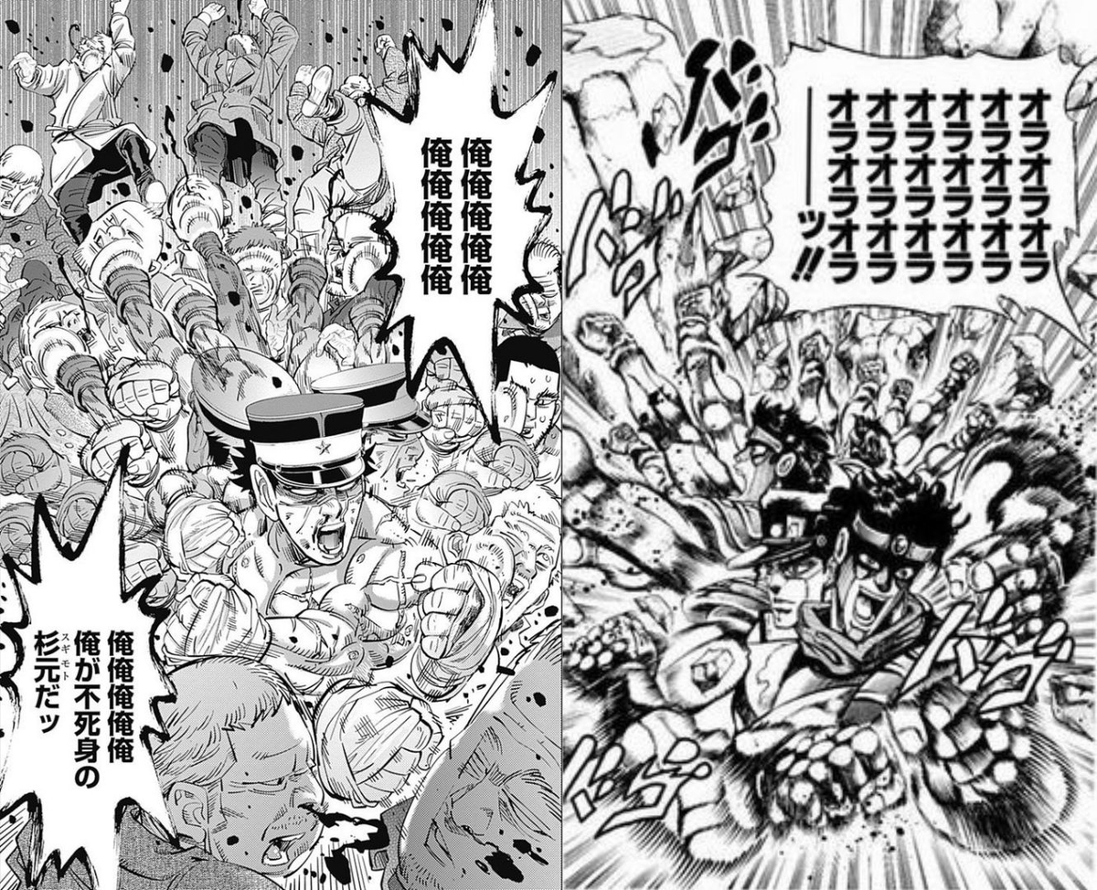 공식팬북에 따르면 노다는 골카에서 죠죠 패러디 생각은 전혀 안했다고 합니다. 30여년 전 쯤 죠죠 1부 읽어서 기억이 가물가물하고. 아마 비슷한 장면이 있다면 과거에 읽었던 장면을 무의식적으로 떠올린 게 아닐까 하네요. 하기야 대놓고 오마주라고 넣은 장면들은 최근 만화는 없고 본인이 좋아했다던 70~90년대 완결만화 위주라서.