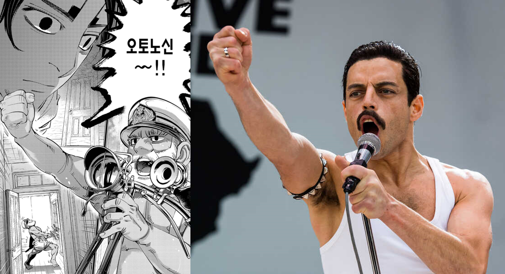 코이토 구출작전에서 '오토노신~~~' 하며 등장한 애비의 포즈 & 의상은 퀸의 프레디 머큐리 오마주. 연재 당시 2018년이라서 영화 '보헤미안 랩소디' 개봉 타이밍이랑 비슷했던 것 같습니다. 코이토의 저 표정은 애비가 진짜 와서 놀랍다는 표정일까 아니면 아부지가 어떤 취향의 남성들에게 어필할 만한 복장으로 등장해서 당황하는 표정일까.