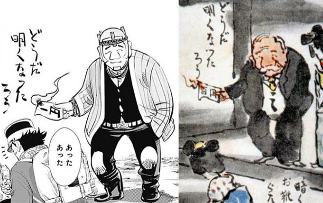 1엔 지폐 태워서 불밝히는 시라이시 그림은 일본 교과서에 나오는 풍자화의 오마주입니다. 시라이시가 코주부가 된 거랑 말풍선대신 글자만 적힌 것도 풍자화의 오마주라서. 아하 왜 말풍선 대신 손글씨로 적혔나 궁금했었는데.