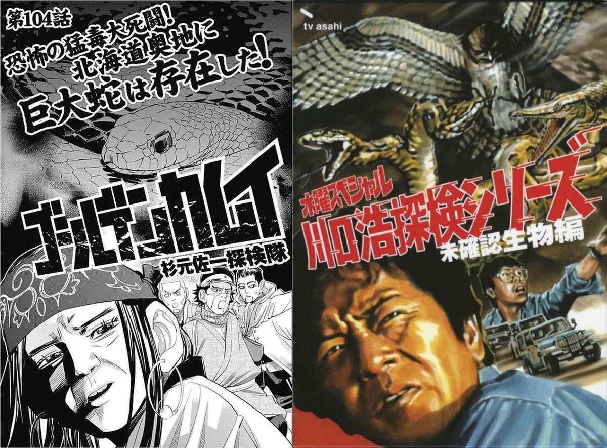104화 '공포의 맹독 대 사투! 홋카이도 오지에 거대뱀은 존재했다'는 TV프로그램인 '카와구치 히로시 탐사대(川口浩探検隊)'의 DVD 커버 패러디입니다. 연재분 타이틀도 방송과 유사한 폰트고.