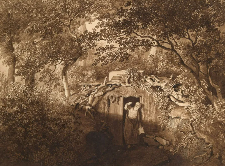 토마시나가 나중에 덧그린 이 은둔자는 20세기의 인물에 의해 세례 요한을 닮았다고 언급됨. 그러나 20세기의 추측과 달리, 은둔자가 생기고 나서 스케치로 그려진 게 아니라 1809년에 그리고 난 뒤에야 시들리 파크의 은둔자가 생긴 거였음.